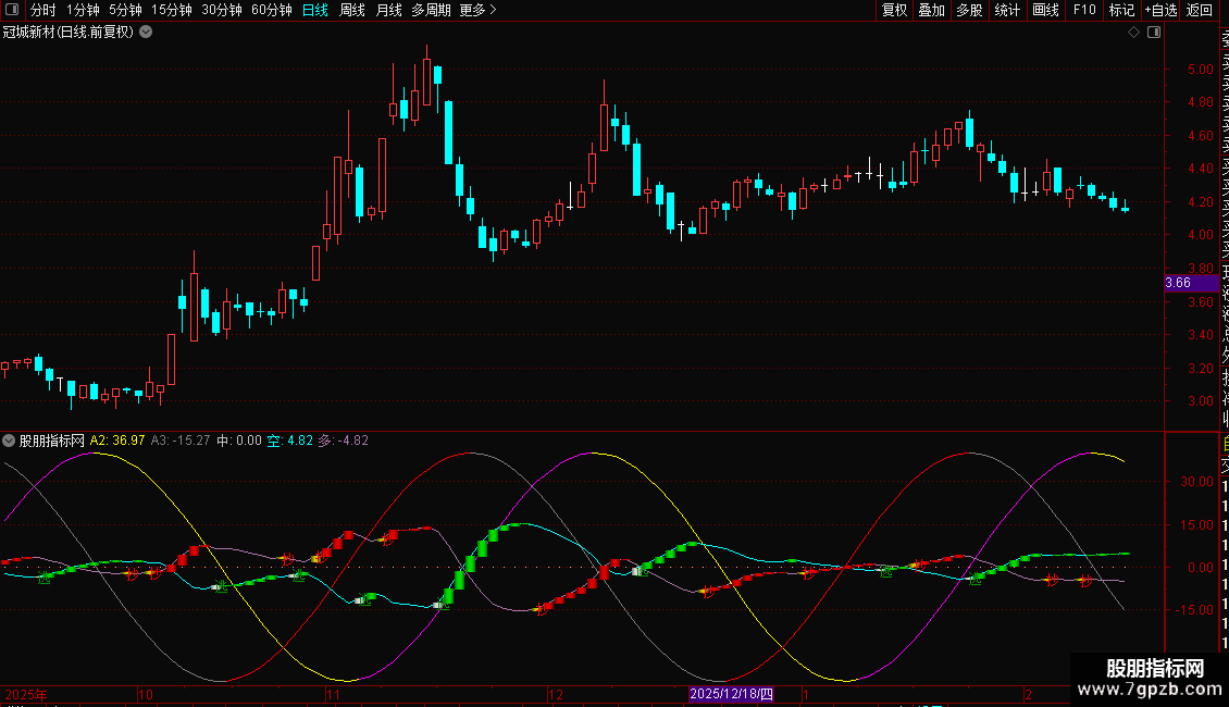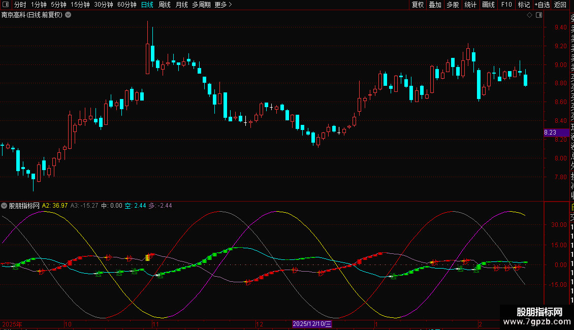 A3线(灰色/红色):基于交易周期数计算的余弦波动线。当A3线向上时显示为红色,向下时显示为灰色。与A2线共同构成波动参考。
