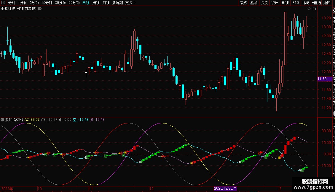 A2线(青色/品红色):基于交易周期数计算的正弦波动线。当A2线向上时显示为品红色,向下时显示为青色。用于观察市场的周期性波动。