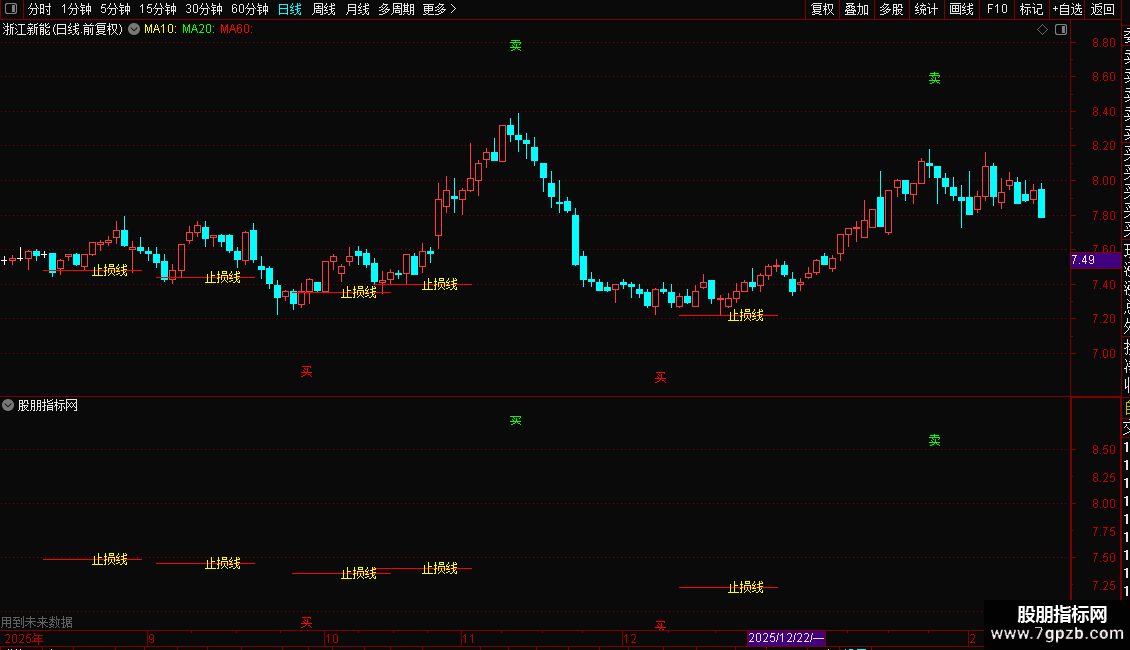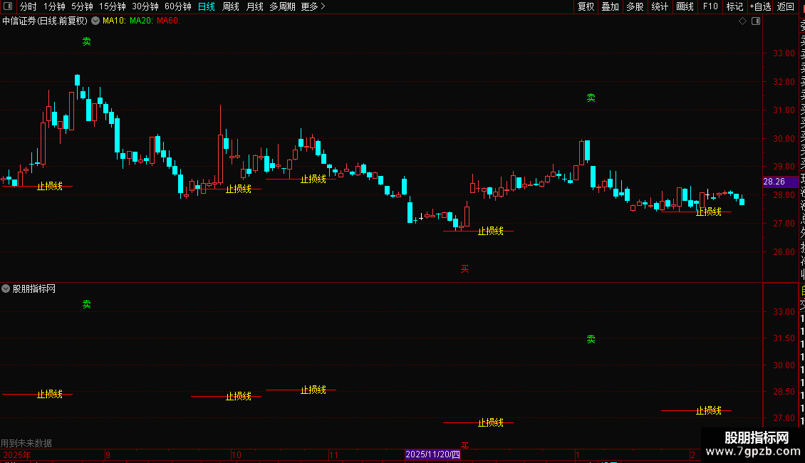 - 当AF成立时,在最近4日最低价位置绘制红色柱状线(高度50,线宽3倍),并标记黄色文字“止损线”。