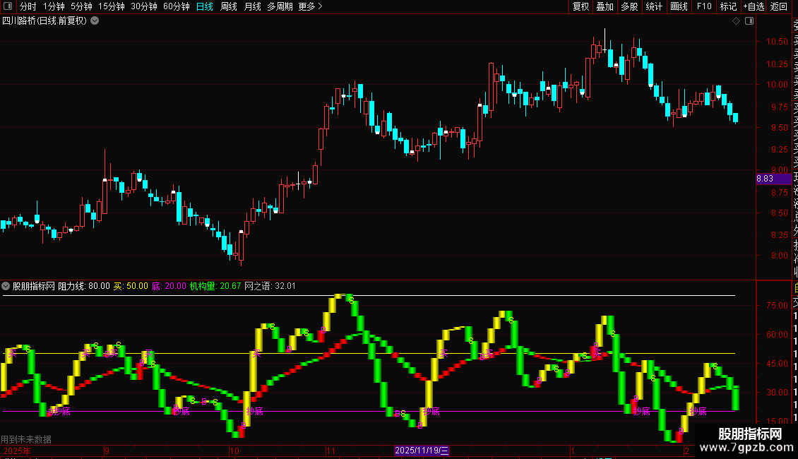 抄底信号:当“机构量”上穿20时,标记“抄底”。