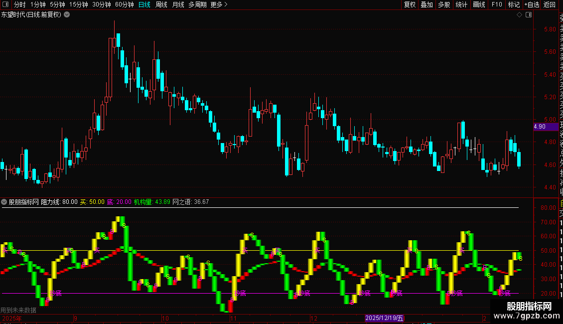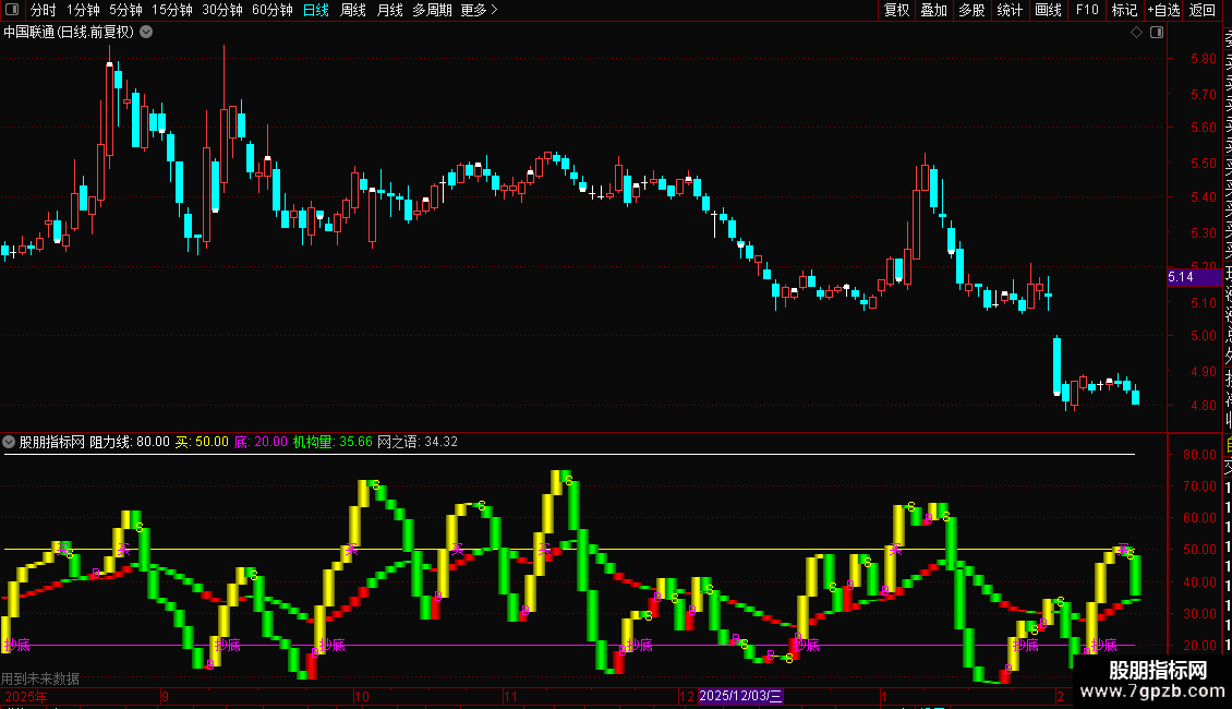 2. 参考线:提供阻力位(80)、买入参考位(50)和底部参考位(20)。