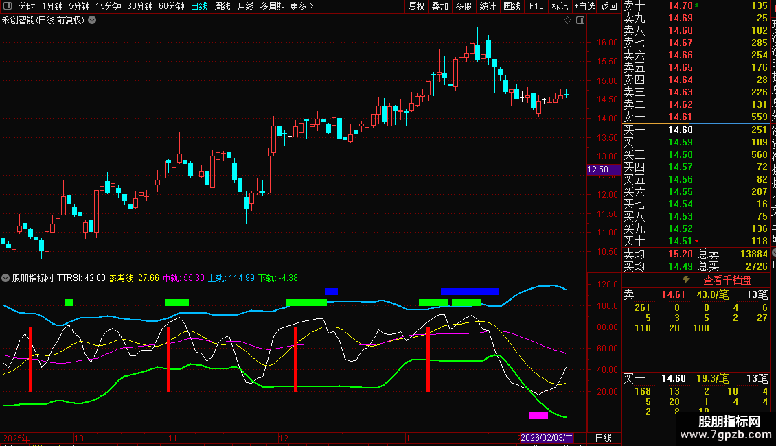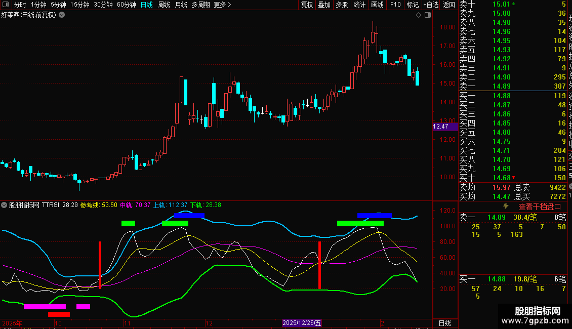 这是一个基于RSI原理的多维动量指标,名为TTRSI。它综合了收盘价、最高价、最低价、开盘价相对于其短期均线的强度,并加入了与大盘指数的关联度分析。