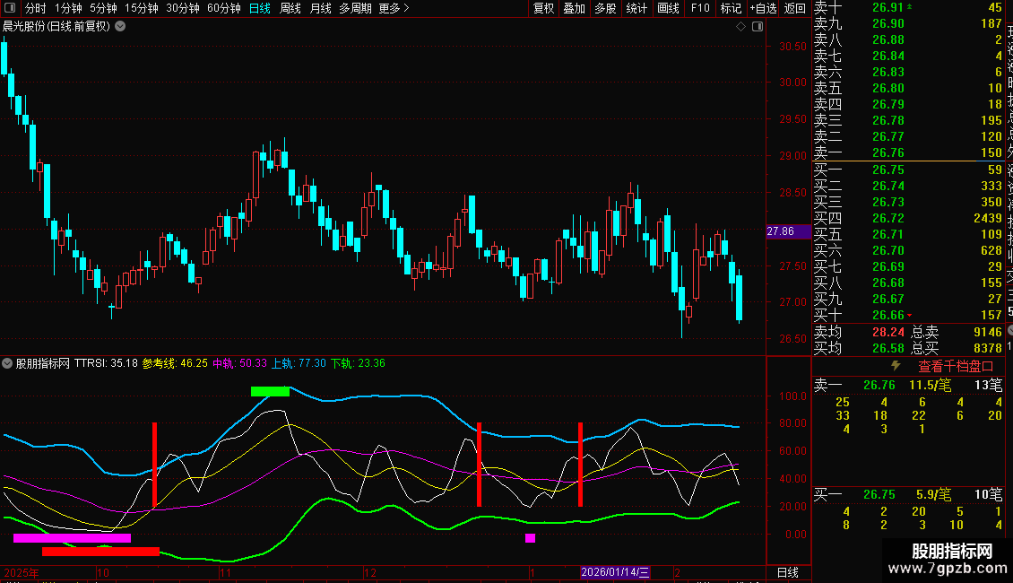 下轨: 中轨- 2*STD(TTRSI,26),LINETHICK2,COLOR00FF00;