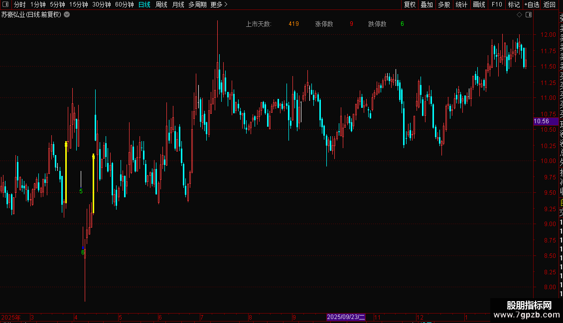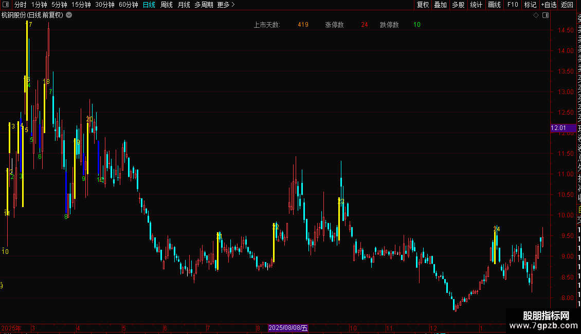 加载指标后,图表上会以青色柱线标记涨停日,以红色柱线标记跌停日。图表左上角区域会实时显示该股上市以来的交易天数、历史涨停总次数和跌停总次数。同时,在每根涨停或跌停K线的相应价格位置,也会标注出截至当日的累计次数。