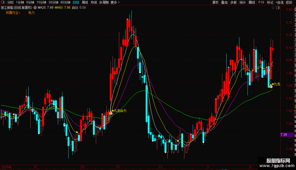 指标主要功能是监控主力资金动向与筹码集中度,识别个股所属板块,并捕捉主力吸筹结束后的爆发点。它通过计算平均成本与市场筹码分布,判断主力是否完成低位建仓。操作策略为:当出现“九天腾龙”或“九龙合力”信号,且伴随放量阳线突破时,视为强力买入时机;红色柱体代表主力积极持仓可跟进,需结合行业板块热点操作。
