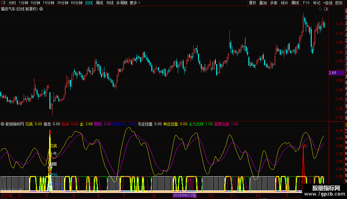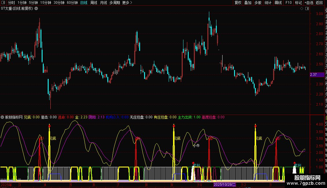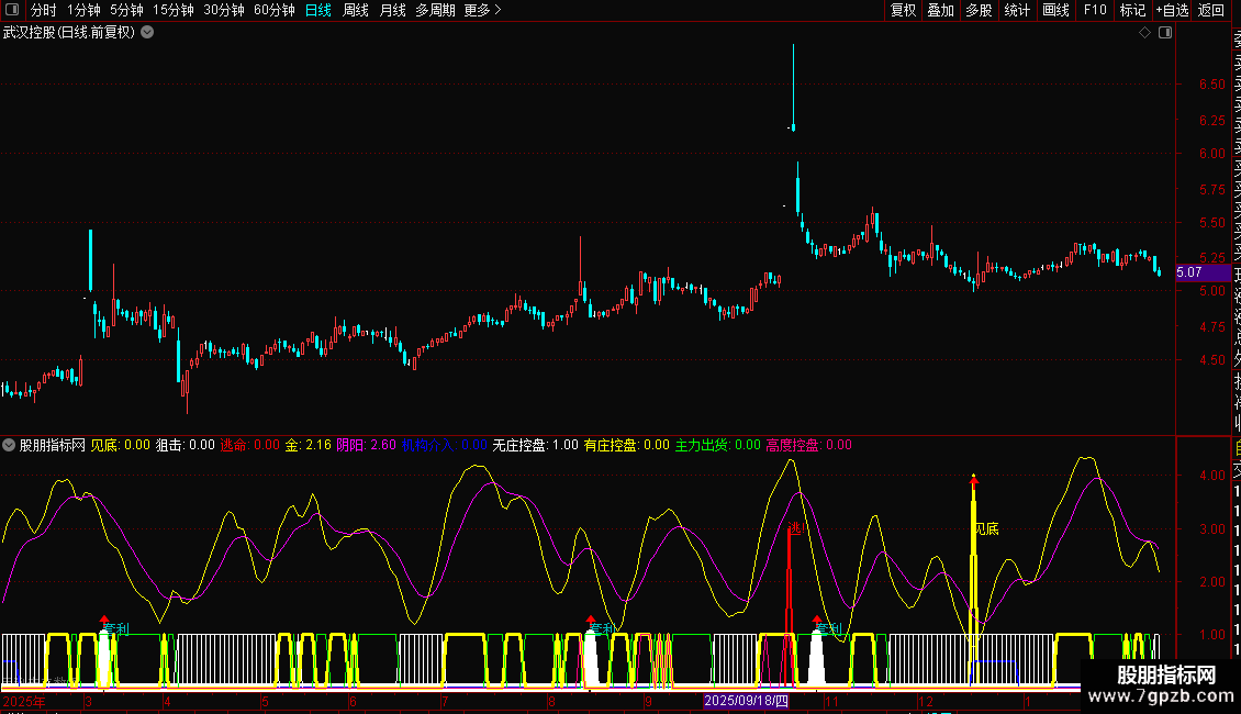指标将多种信号(如见底、买入、卖出、资金状态)集成在一个副图窗口中显示。