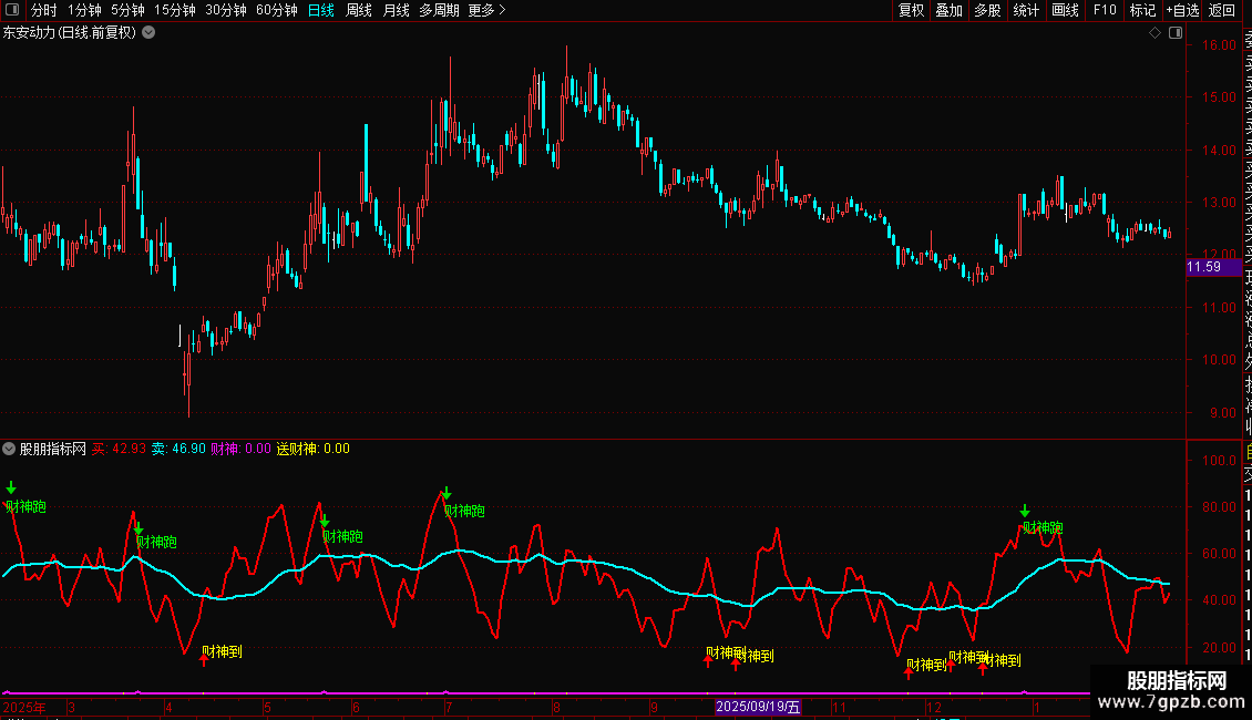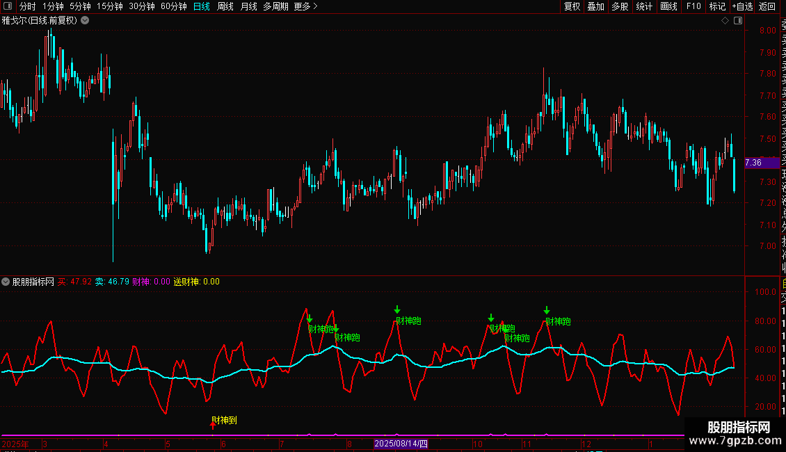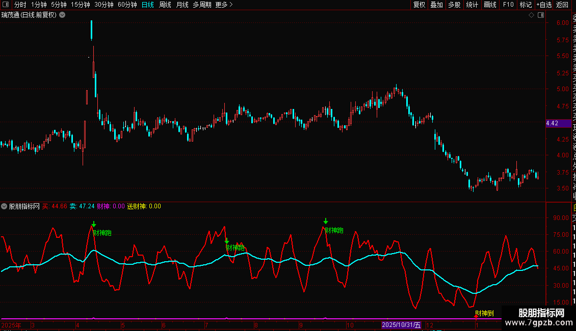 指标基于RSI与KDJ原理构建,包含两条信号线(买、卖)和两个财神信号(财神跑、财神到)。