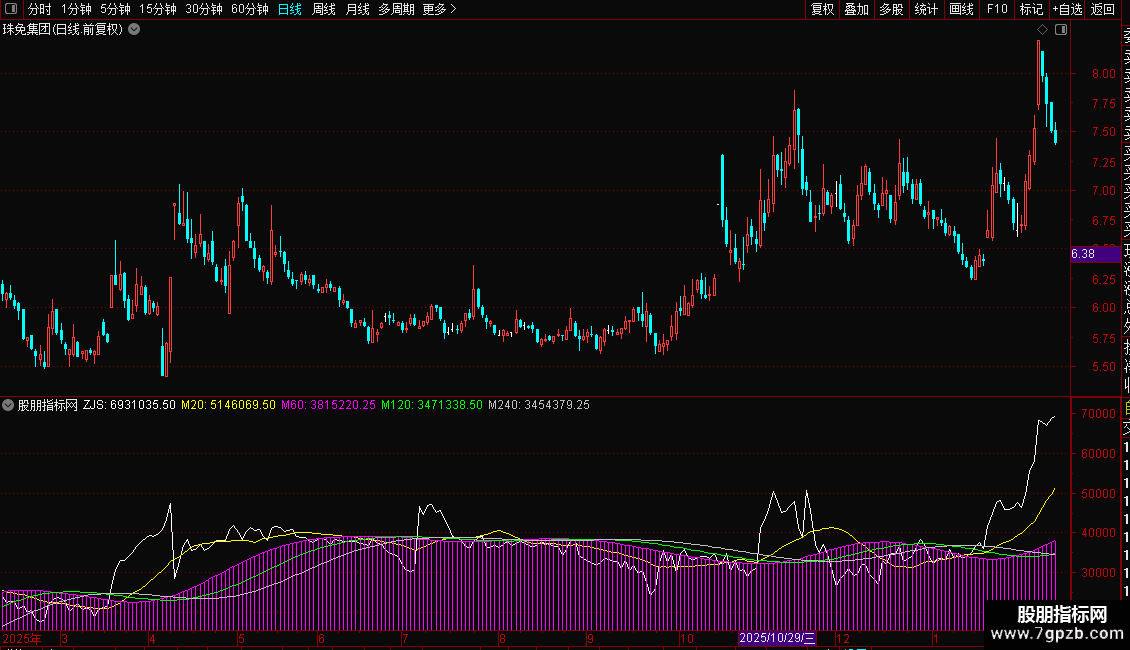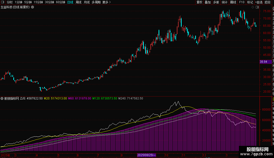 指标通过计算日内分时数据,分析资金流向。核心是“主净入”,由主买与主卖差值求得,代表资金净流入。ZJS为当日累计净流入值。后续均线(M20、M60、M120、M240)用于平滑ZJS,形成多周期趋势线,辅助判断资金流向的短期与长期态势。