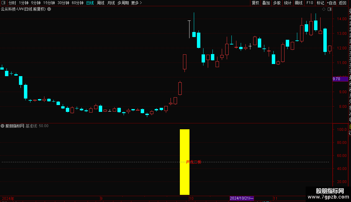 通达信副图指标,专为强势股短线接力打造,紧扣经典二龙两板战法逻辑,信号直观清晰。指标在符合强势两板结构的关键位置,自动发出黄色信号柱提示,精准捕捉个股启动节点,助力识别强势股二次发力机会。指标不预测、不承诺收益,仅作为技术参考工具,适配短线强势股跟踪,信号简洁易懂,电脑与手机端均可正常使用,方便快速盯盘、辅助判断个股接力机会。