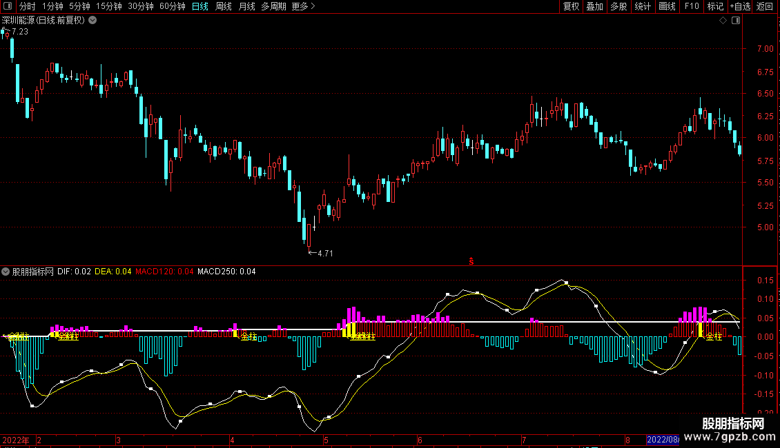 STICKLINE(MACD>=MACD250,MACD250,MACD,2,0),COLORMAGENTA;