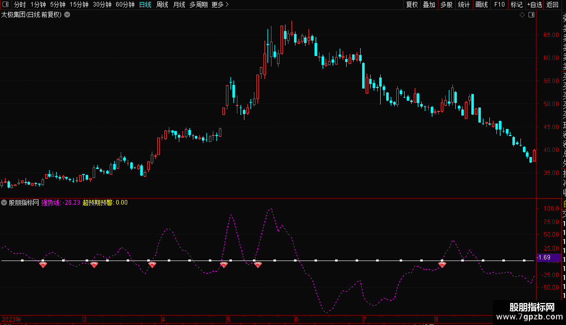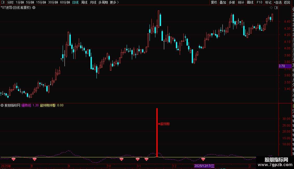 DRAWICON(CROSS(强势线,超预期预警),超预期预警*1.002,25);