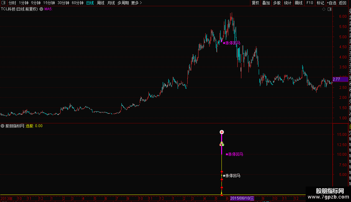 DRAWTEXT(FILTER(XG=1,5),LOW-0.05, ' ★涨停回马'),COLORFF00FF;