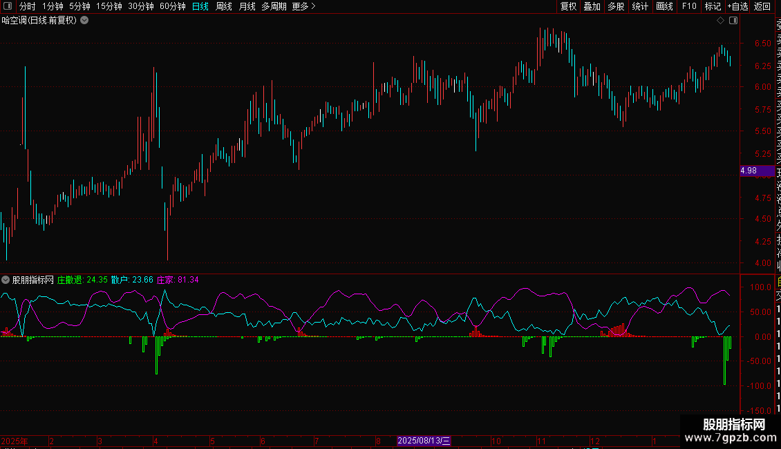 4. 庄家:紫线,代表主力资金动向,与散户线形成对比。