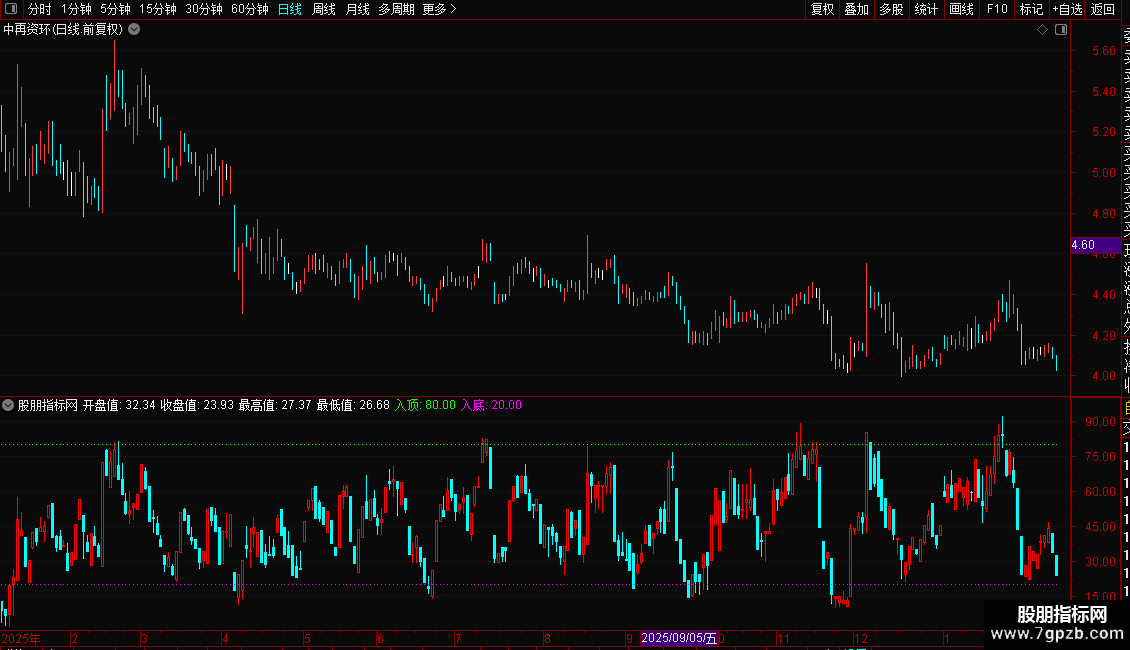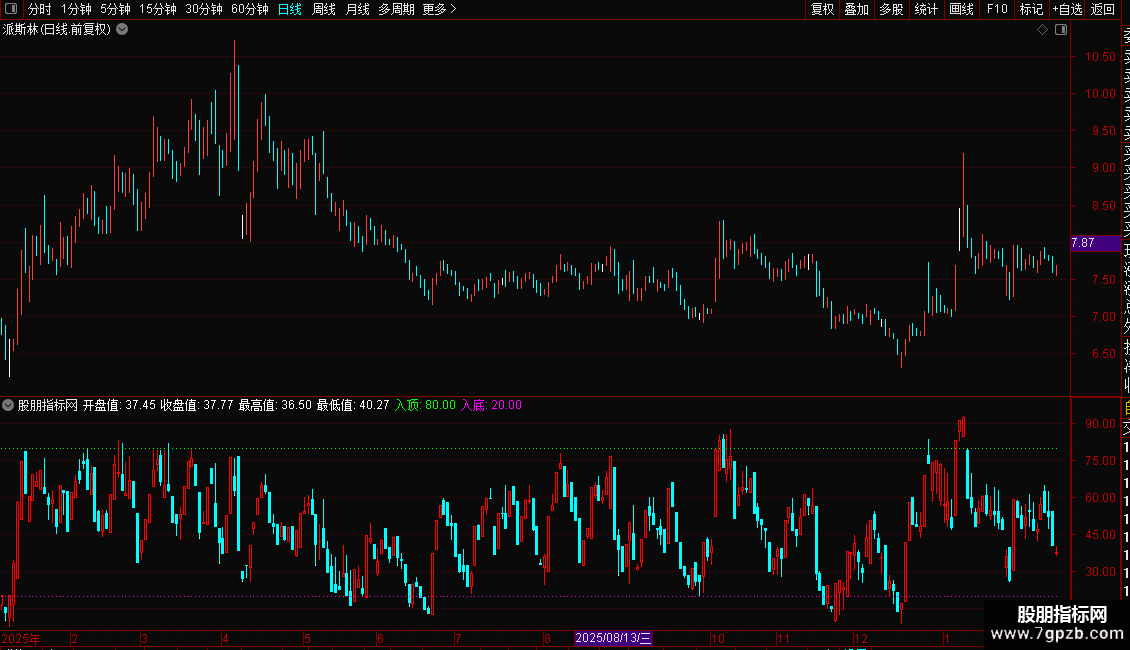 此外,指标包含一个综合信号(VAR13),该信号在满足特定条件时(如价格与成交量关系、短期相对位置超跌及价格动量极度疲软)会输出数值30。图表中还设置了80和20两条水平参考线,用于标识数值的潜在超买和超卖区域。