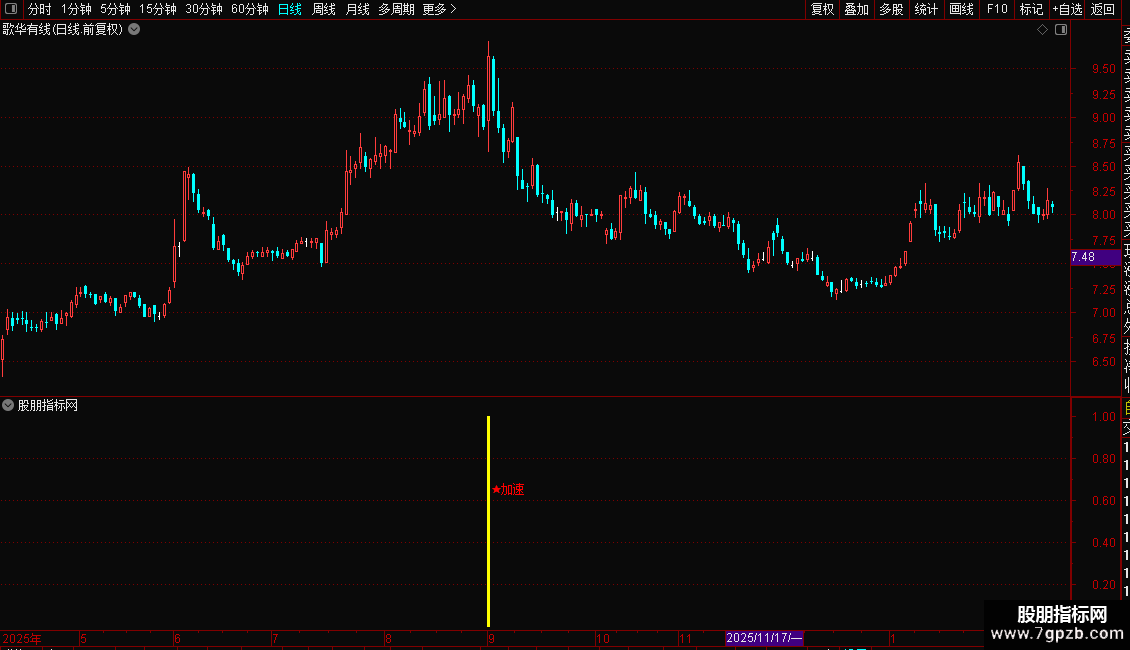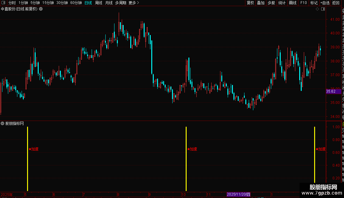 当指标在K线图上出现洋红色的柱状线并伴有“★加速”的文字提示时,表明股价已进入强势拉升区,是激进型投资者的介入良机。建议结合当时的市场热点与成交量变化进行确认,若出现信号时伴随成交量显著放大,则信号可靠性更高。稳健型投资者可等待股价回踩关键均线支撑位不破后再行加仓。止损位可设置在信号出现当日的最低价或关键均线之下。