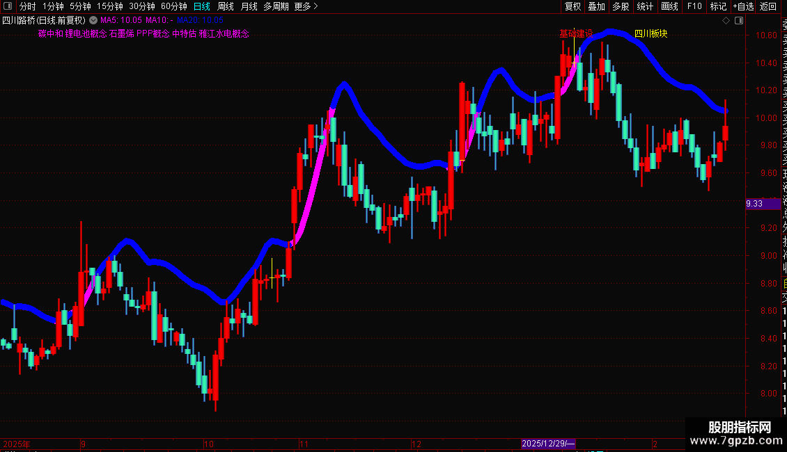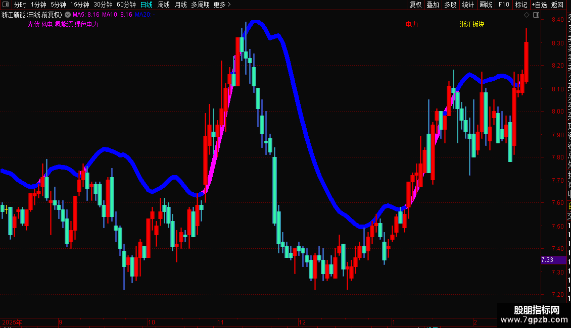 “智富趋势线”是一款智能主图指标,核心通过动态计算价格中枢与支撑位,生成一条粗壮的多空生命线(WEKR)。当股价站上该线,线条变为洋红色,彰显强势多头;跌破则转为蓝色,警示空头主导。更亮眼的是其独创的“冲”字信号——当日涨幅超7%且由线下强势突破线上时,自动标记黄色“冲”字,精准捕捉主力暴力拉升的启动点。