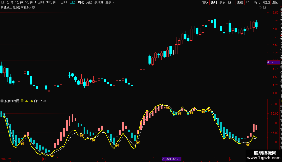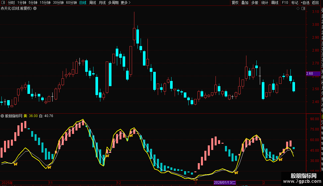 1. 计算KDJ指标,通过红蓝柱状线直观显示K线与D线的金叉死叉。