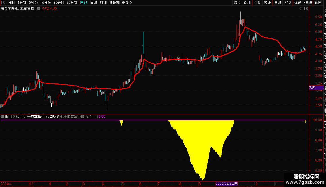 - 绘制90%和70%成本集中度数值,数值越小代表筹码越集中。