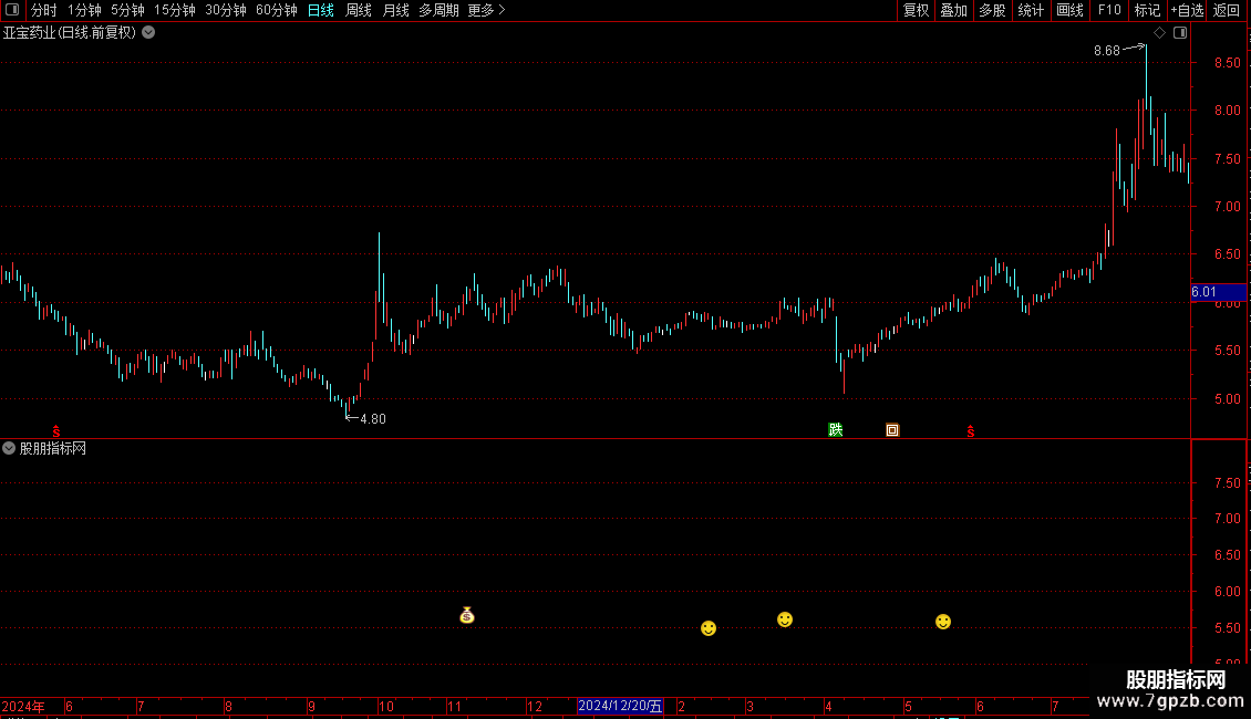 2. 第二波信号(VV4): 当35日和70日均线均已站在170日线上方,且35日线上穿70日线时,在K线下方标记笑脸图标。这通常代表强势趋势中的短期加速信号。