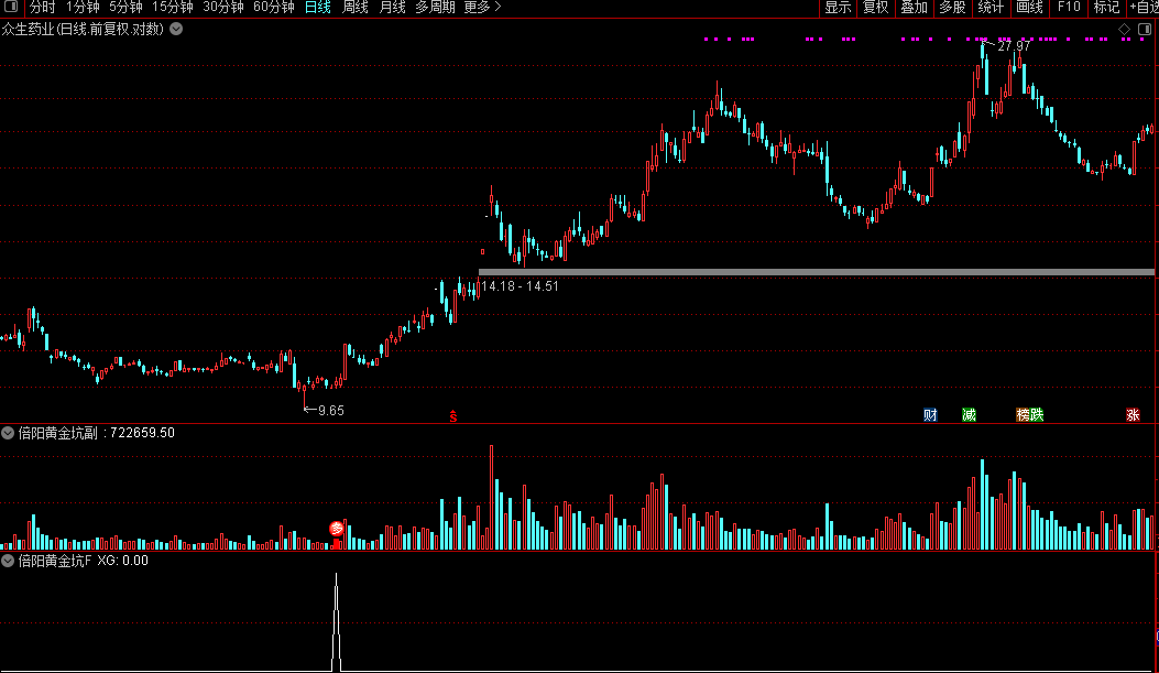 通达信『倍阳黄金坑』副图/选股针对底部出现首次倍量阳线量化源码