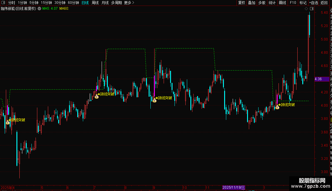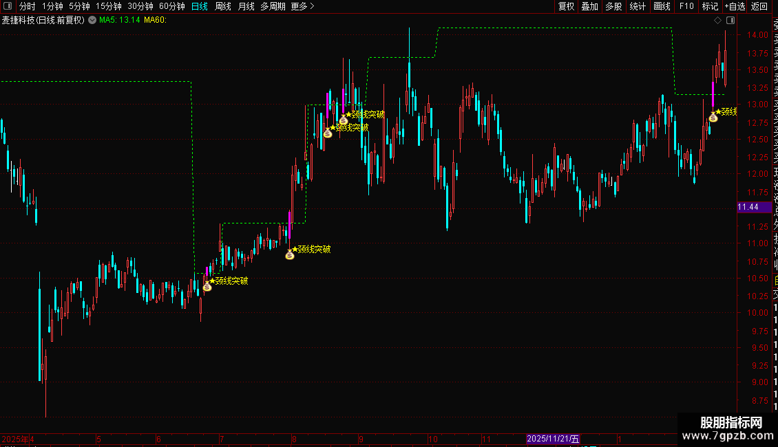 DRAWTEXT(IF(VAR1>VAR14,IF(REF(VAR9< VAR14,1),1,0),0),L,' ★颈线突破'),COLORYELLOW;