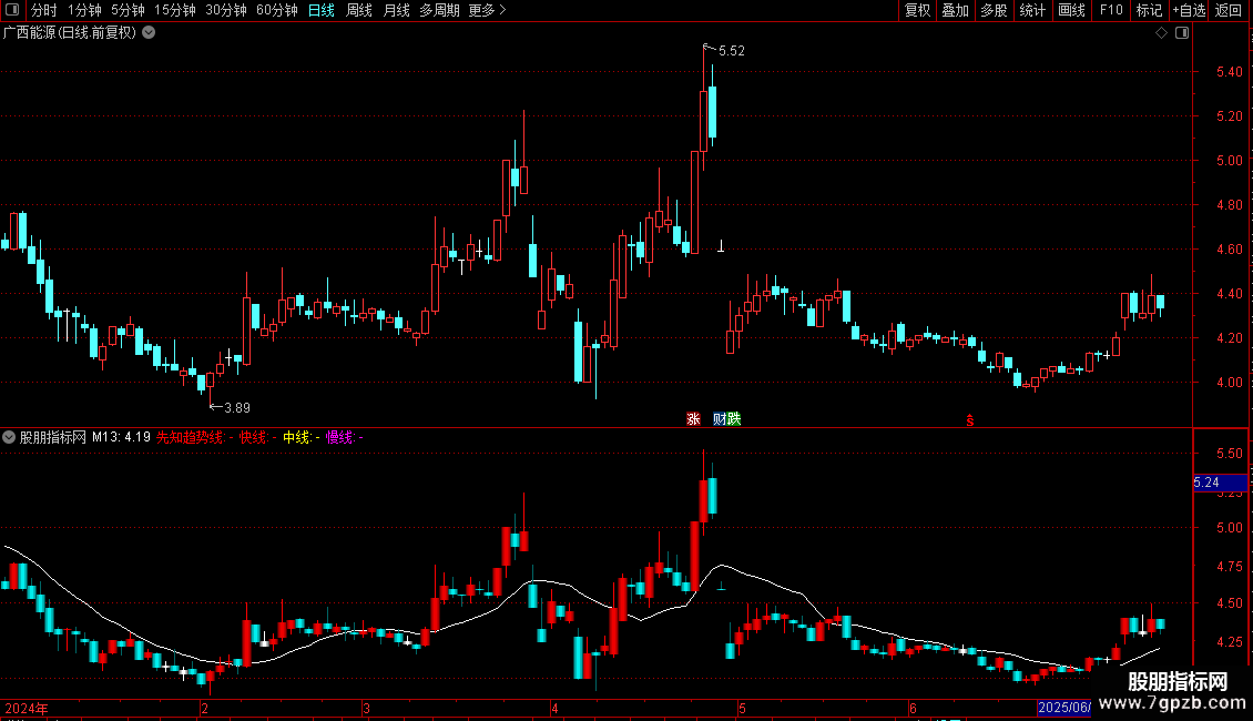 2. 多空趋势线:提供“先知趋势线”(34日均线)以及由快线、中线、慢线构成的一组短期趋势线,用于判断价格的中短期趋势方向。