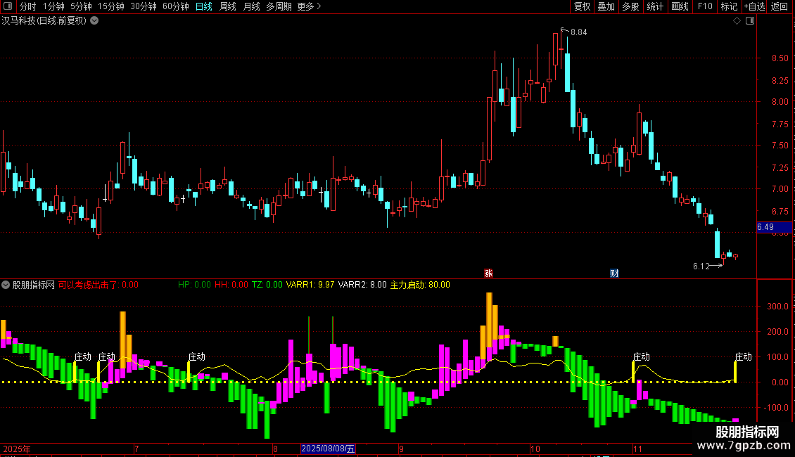 “主力启动”信号柱和“庄动”文字提供辅助的短线启动参考。