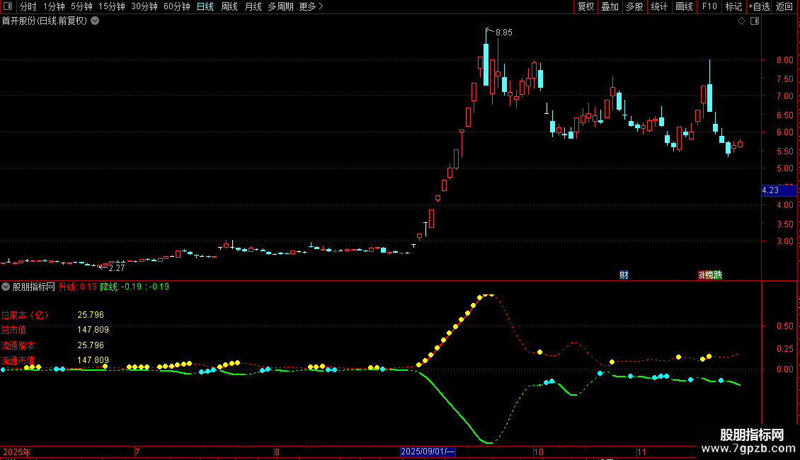 1. 财务数据显示:在画面左上角固定位置显示总股本、总市值、流通股本、流通市值四项关键财务数据,数值以亿为单位。