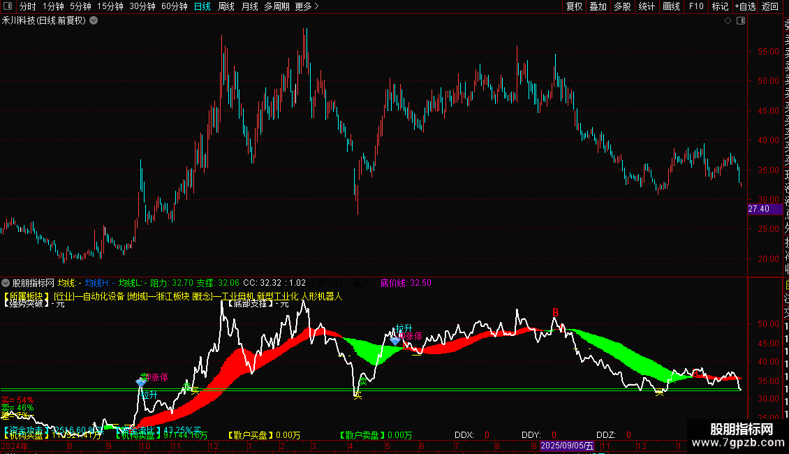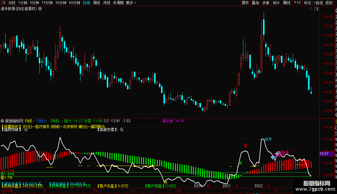 通过7周期与4周期的信号滤波算法,对横盘突破或破位信号做冗余剔除,结合60周期分时均线的趋势强弱界定做二次过滤,形成趋势势能加量能强度加价格结构的三重共振信号输出,锚定主力主动进攻或出逃的临界拐点,提升股票公式指标信号的纯净度。