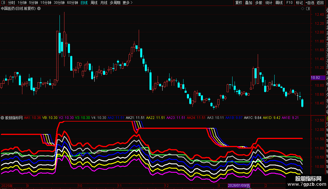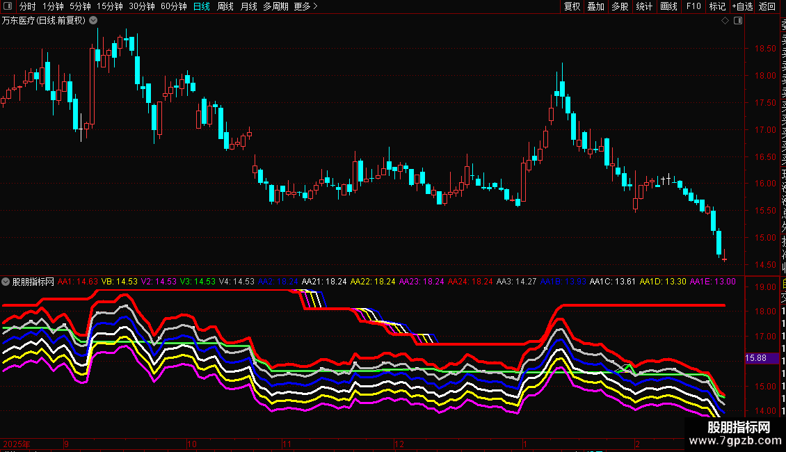 AA1:(2*CLOSE+HIGH+LOW)/4,COLORRED,LINETHICK4; VB:LLV(LOW,21),LINETHICK1;V2:LLV(LOW,20),LINETHICK1;V3:LLV(LOW,19),LINETHICK3;V4:LLV(LOW,18),LINETHICK1;