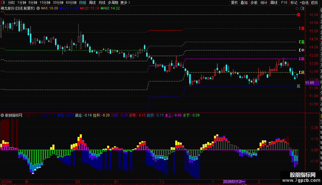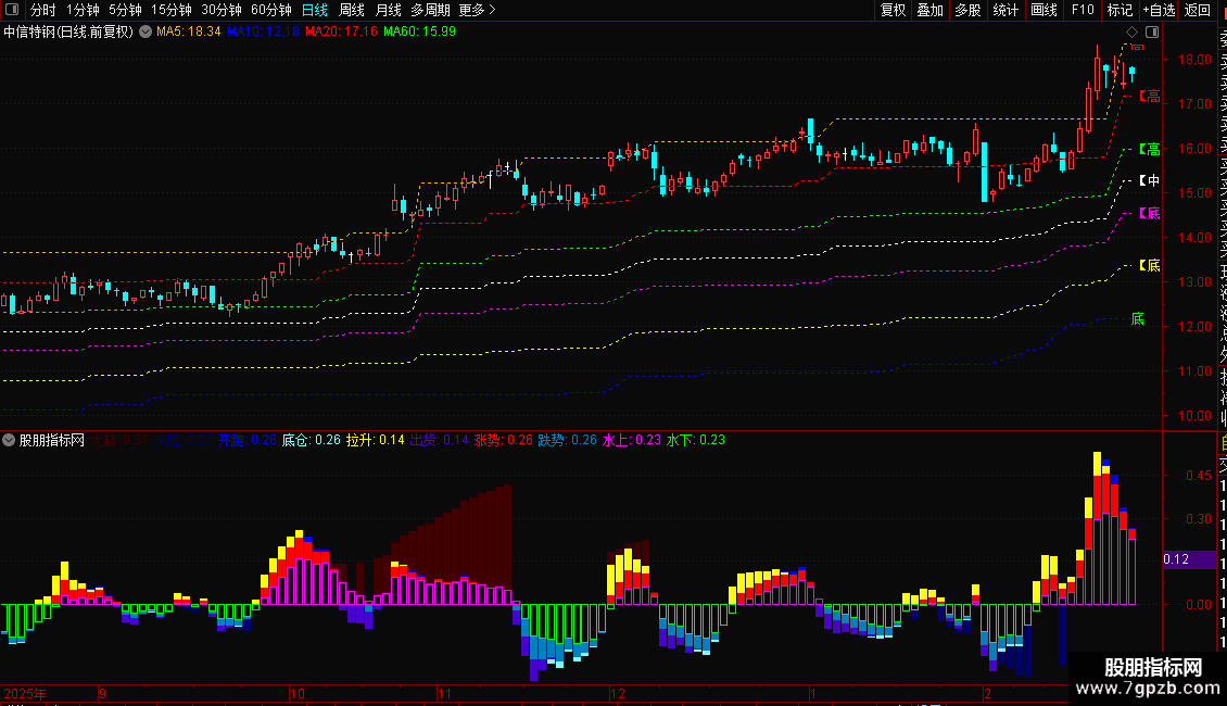 副图(趋势):不同于传统的单一MACD,它叠加了5组不同参数的MACD柱状图(从超长线到短线),通过不同颜色和粗细的柱体,直观展示从大趋势到小波段的多空力量变化。