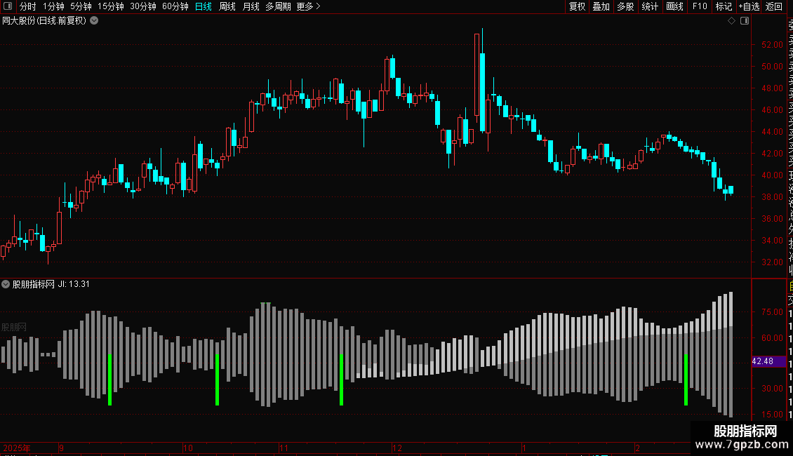 打开个股K线,调出极致爆发副图。出现以下特征即可买入持有: