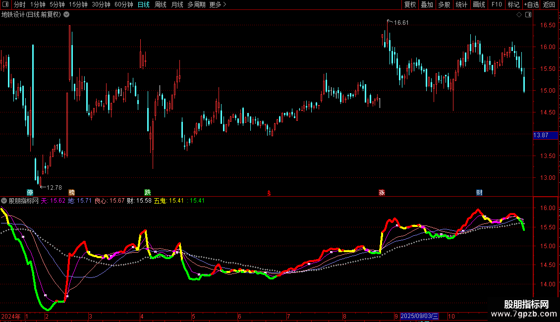 指标通过计算不同周期的移动平均线组合,构建了“天、地、良心、财、五鬼”五条核心均线。其核心逻辑是依据“五鬼”线相对于其他均线的位置关系,以及P1与P3两条复合均线的比较,来动态改变“五鬼”线的颜色和粗细,从而直观显示当前价格在不同层级均线系统中的强弱状态和趋势信号。