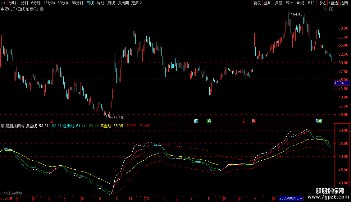 指标包含三条核心线:多空线(白色/绿色)、进出线(紫色/绿色)和黄金线(黄色)。