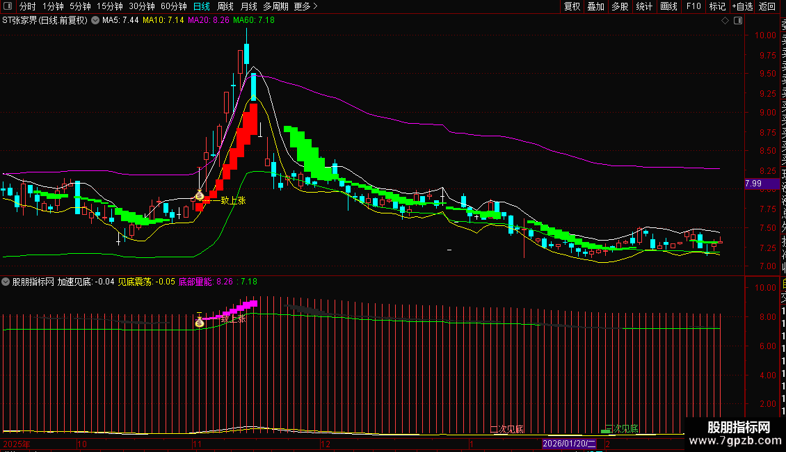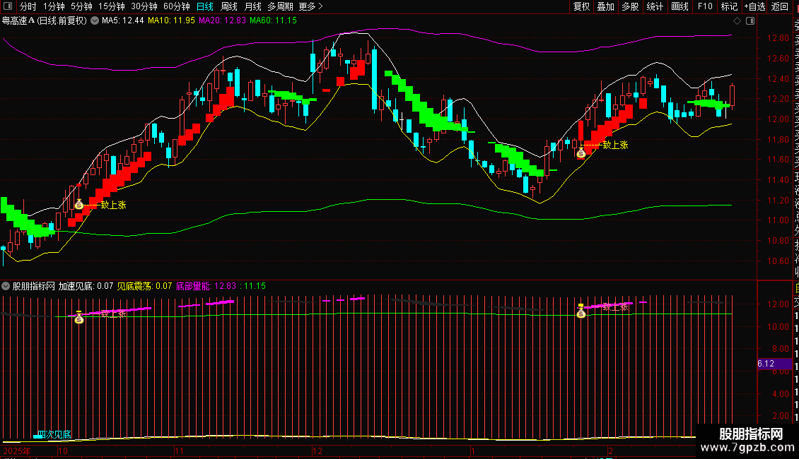 2. 副图指标:关注彩色柱体标注的见底次数,“六次见底”提示底部震荡,“八次九次见底”伴随“底部吸筹/即将拉升”文字,是关键加仓信号;
