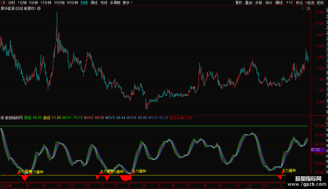 核心买入信号:当出现“主力播种”的图标和文字提示时,表明指标发出主力入场信号,可作为潜在的买入或关注时机。