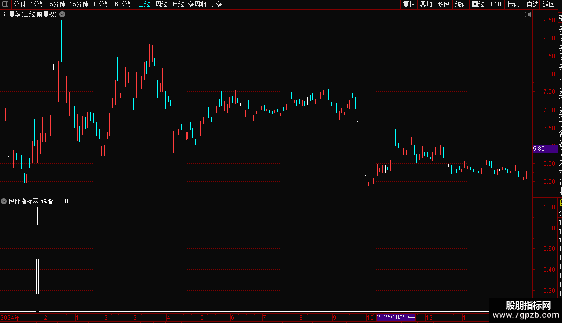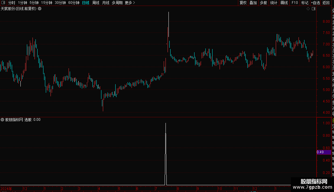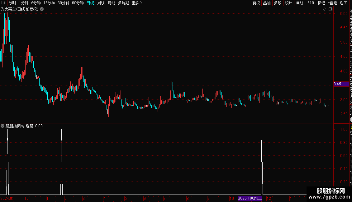 2. 加载后,指标会标记符合“选股”条件的信号点。