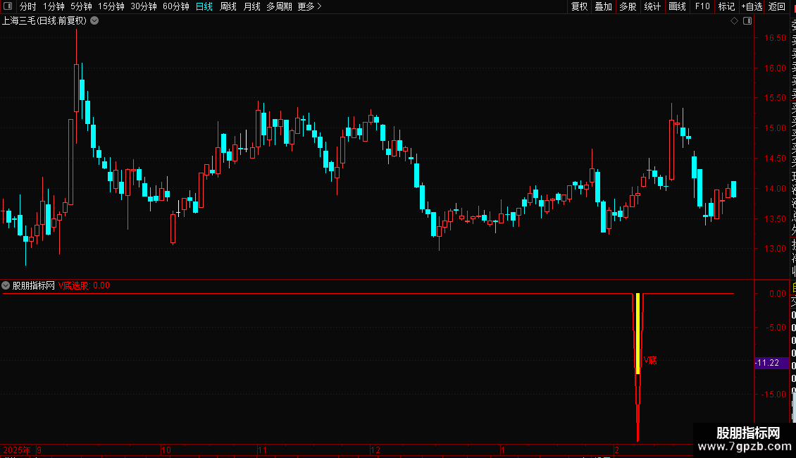 DRAWTEXT(GSKZ-HG=2 AND GSKZ>REF(GSKZ,1),-10,' V底'),COLORRED;