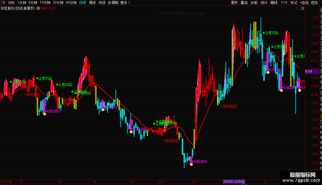 动能启动:当K线底部出现紫色“★动能启动”图标及文字时,代表短期下跌动能衰竭,股价可能迎来爆发,是短线介入的良机。
