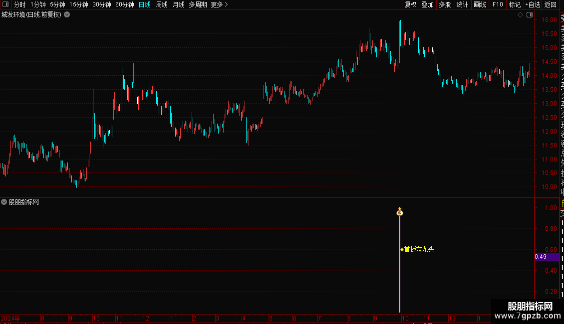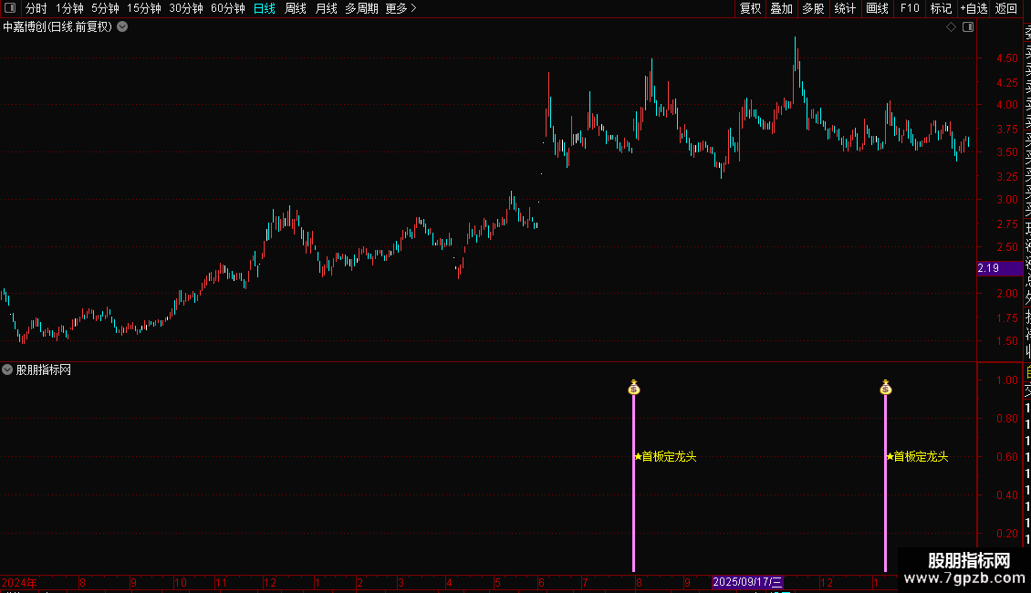 当满足所有复合条件时,指标会在副图以彩色柱状线和图标“★首板定龙头”标记出信号点,提示关注。