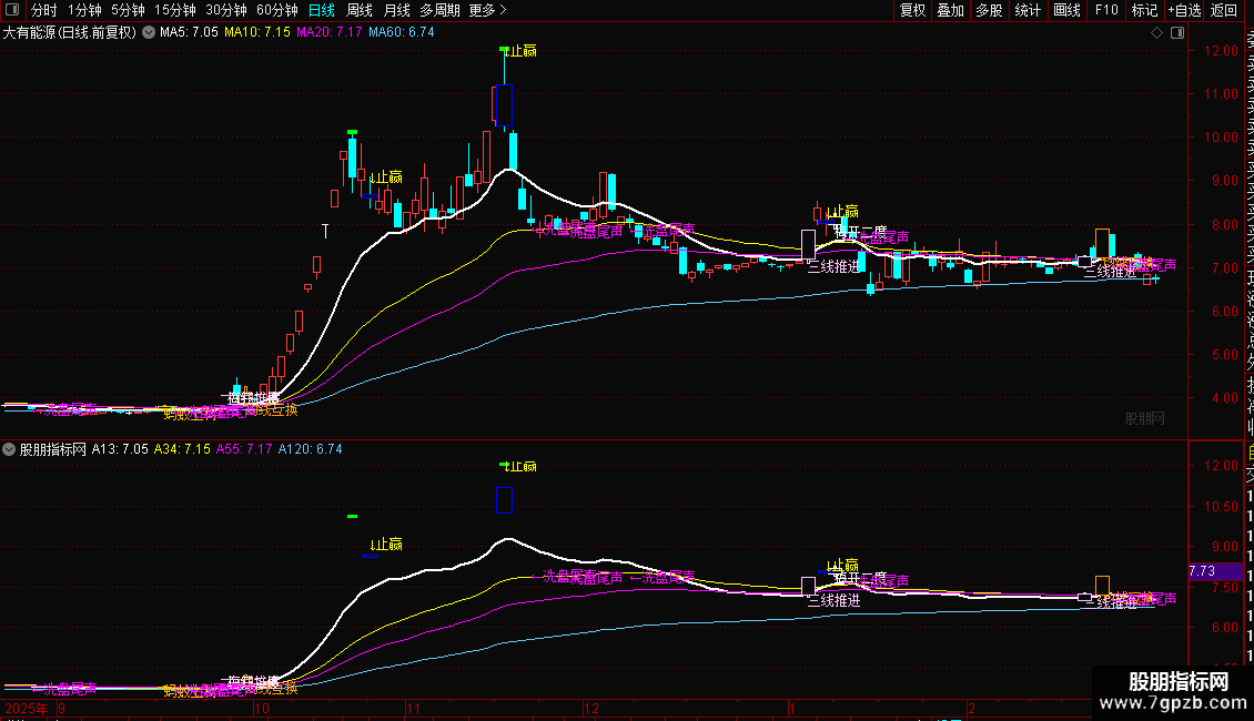 六、三线推进:EMA13、34、55三线齐升,股价同步站上三线;粉紫文字+细线画柱,多头确认信号可重仓跟进。