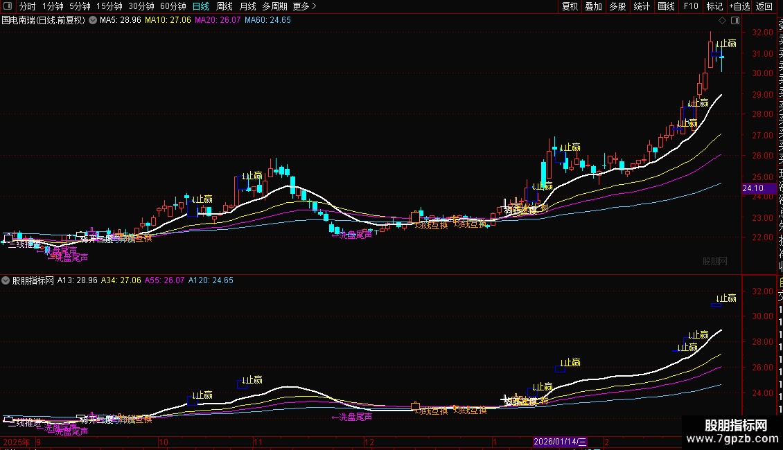 三、红衣侠女:放量上涨突破13EMA,3根K线内完成13EMA与55EMA黄金交叉;粉红文字+粗线画柱,短线动能爆发,配合分时买点快速跟进。