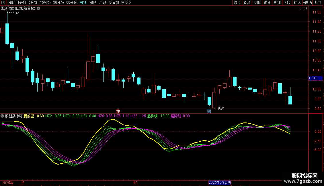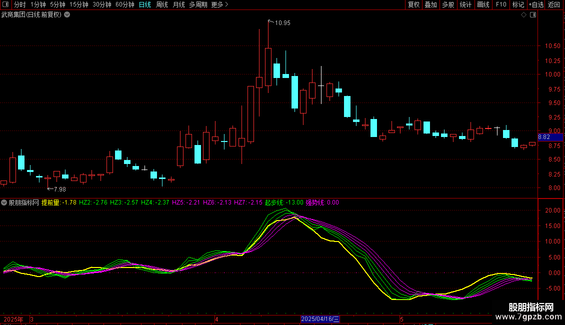 2. 趋势信号:对ROC进行多重指数平滑(EMA),生成多条平滑曲线(HZ1至HZ7),用于识别和确认动量趋势的强弱与方向转换。