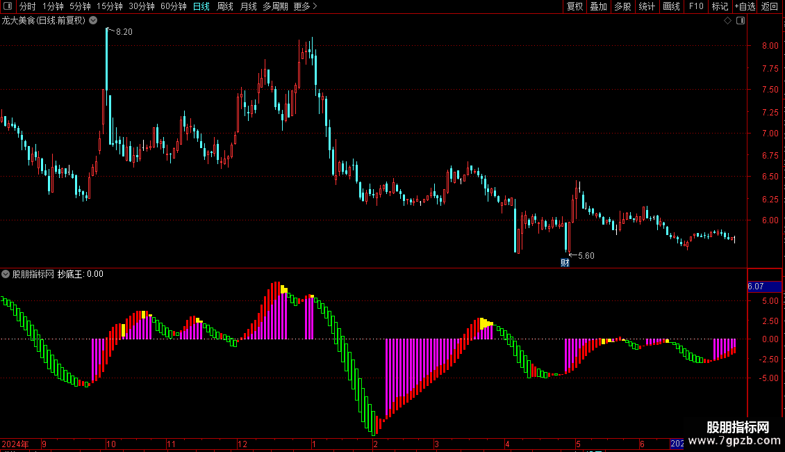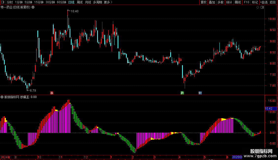 指标通过多组均线、价格偏离度及成交量分析,识别趋势状态与底部信号。主图以柱状线区分“持股”、“持币”、“反转”、“洗盘”四种状态,并设有“抄底王”文字标记,提示潜在底部反弹机会。适用于中短线趋势跟踪与超跌反弹捕捉。