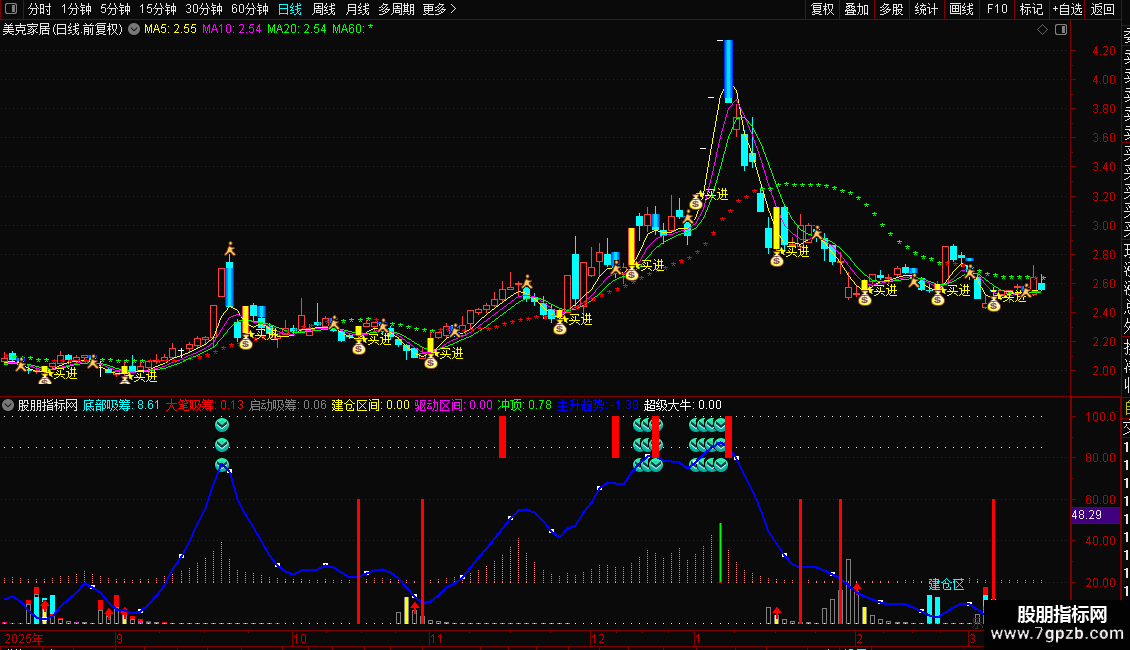 2. 当幅图出现红色量能柱,同时主图发出买进信号时,两者共振代表股票行情已经见底,这是一个可靠的底部买入信号,投资者可重点关注这一股票底部买入技巧。