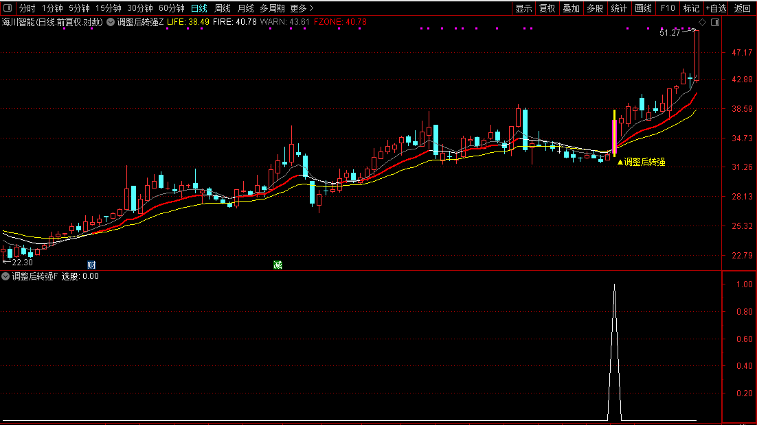 买入信号:当K线图上出现粉紫色的“▲调整后转强”标记时,视为一个交易信号。该标记表明,股价在经历充分调整后,可能即将开启新一轮上涨行情,投资者可将其作为择机买入的参考依据。