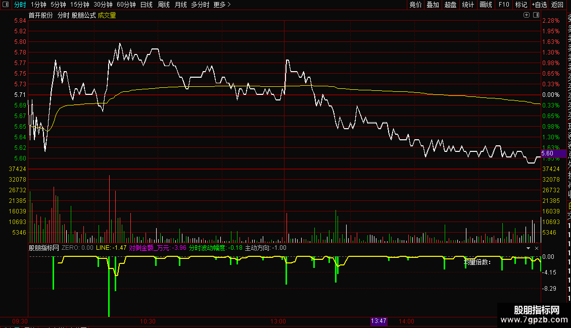 需在 “分时图” 或 “分钟 K 线” 周期下使用(如 5 分钟 K 线),日线周期下参考意义低。