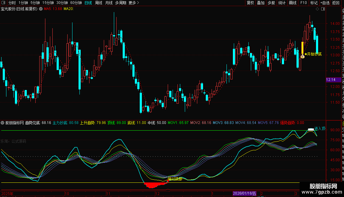 1. **主图指标**:以5日均线为基础,结合EMA均线差值和价格震荡因子(DD),满足多条件共振时,会在K线标注黄色柱体、“★开始抄底”文字及买入图标,直观提示抄底信号。