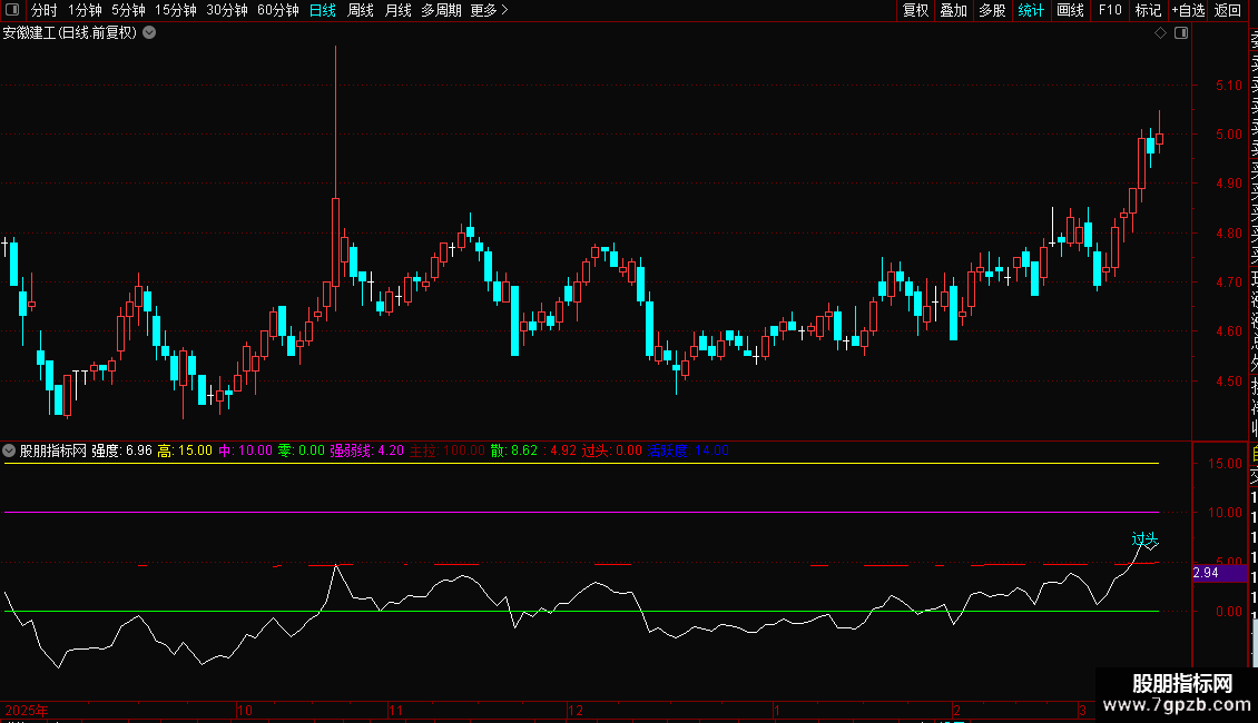 STICKLINE(强弱线=4.2 AND 强度>=15,15,强度,4,0),COLORFF00FF;