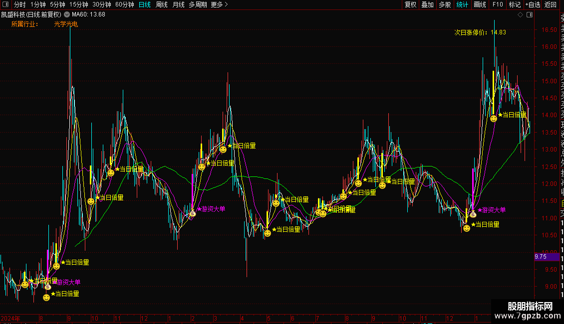 指标主要功能是辅助短线交易,实时显示个股所属板块及次日理论涨停价,帮助投资者预判空间。核心策略是通过均线系统和特殊算法,识别“倍量阳线”与“游资大单”进场信号:当出现黄色柱体提示当日倍量时,关注主力建仓迹象;若出现紫色柱体并标注“游资大单”,则意味着资金强势介入且形态突破,是更明确的短线追涨买点。